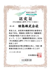 このたび田島株式会社は、経済産業省と日本健康会議が推進する健康経営優良法人認定制度において、「健康経営優良法人2026(中小規模法人部門)」 に認定され、あわせて 「ブライト500」 に選出されました。