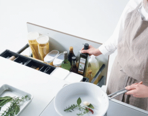 たっぷりラクラク収納:手元の使いやすさにこだわった大容量の収納。小さい調理道具や調味料もすっきり整理でき、作業中の出し入れもラクラク&スピーディー。