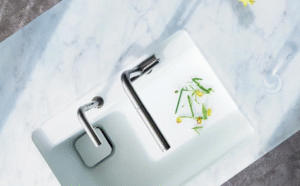 クリスタルカウンター:自然光や照明など、当たる光によって表情が変化。透明感と明るさのあるカウンターは、使うたびに美しさを実感できる上質な仕上がりです。