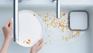 スクエアすべり台シンク:シンク底面・網かご・排水口につけた傾斜が特長。水やごみが流れやすく、汚れがたまりにくい構造です。シンプルなスクエア形状で、お手入れラクラク。